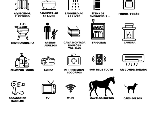 Churrasqueira, banheiras, forno elétrico, fogão industrial, forno, cozinha equipada, banheiro externo, dois ar-condicionados, secador de cabelo, internet, tv, som bluetooth, cama queen size, salamandra, varal de luz, fire pit.